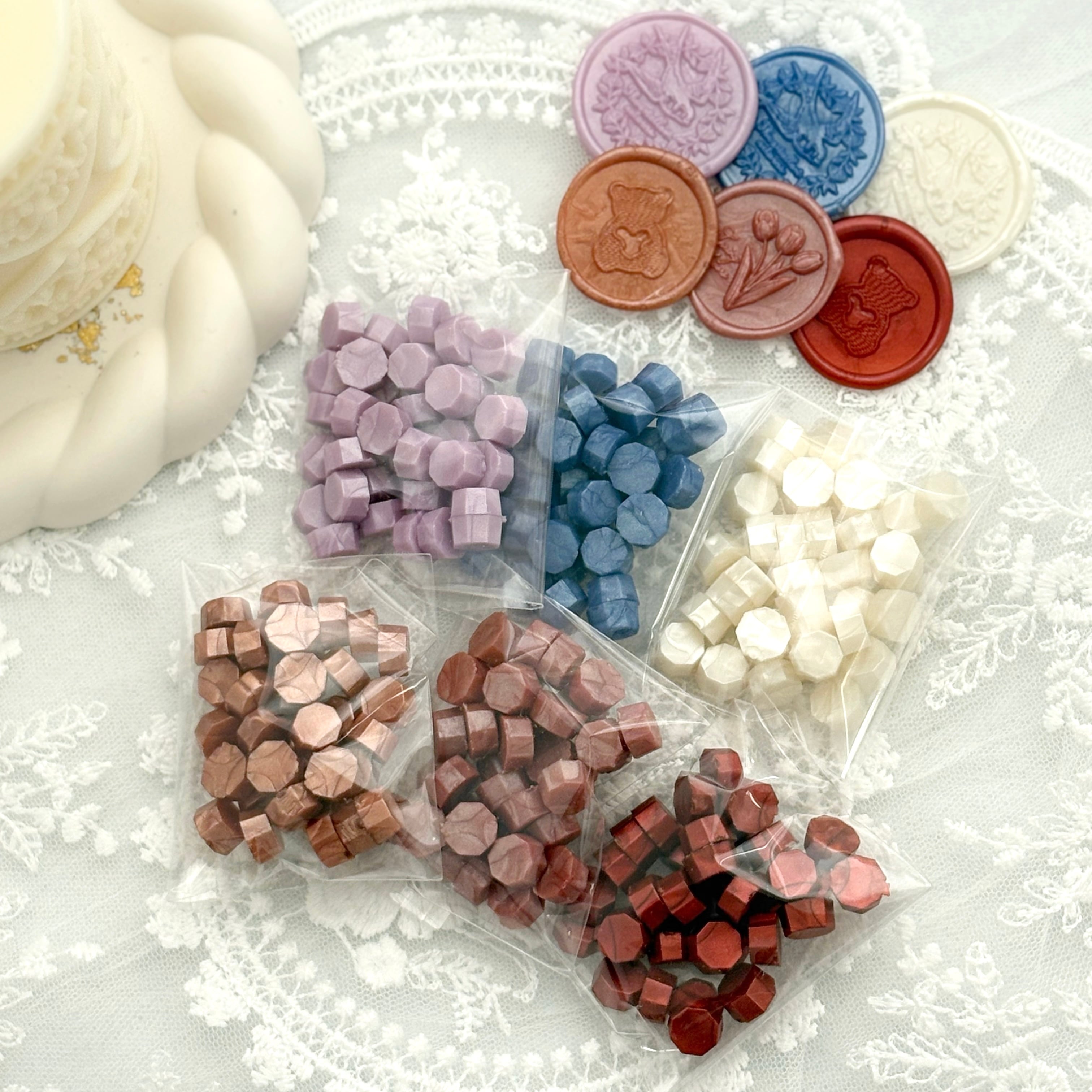 アンティークレッド、アンティークピンク、パールピンク、パールライラック、パールブルー、パールホワイトの6色入です。