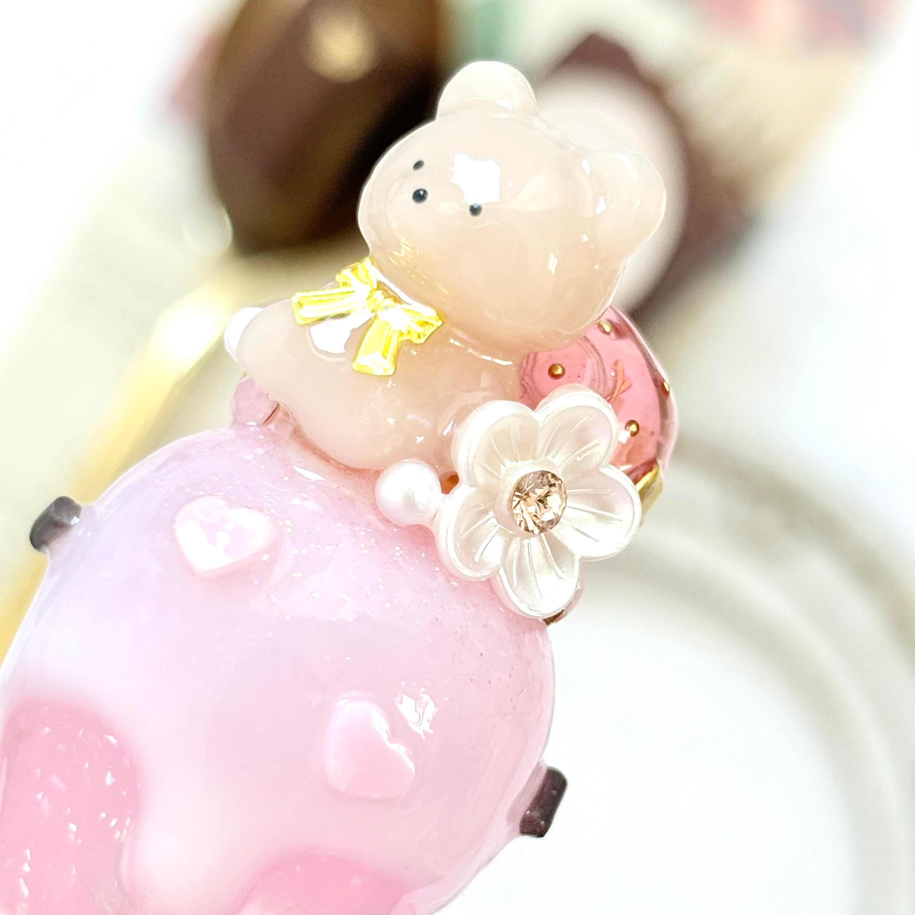 ・上部のデコレーション部分は接着剤で簡単に外れないように接着していますが、絶妙なバランスで乗せているため無理に力を入れるとストーンなどが外れてしまう場合があります。