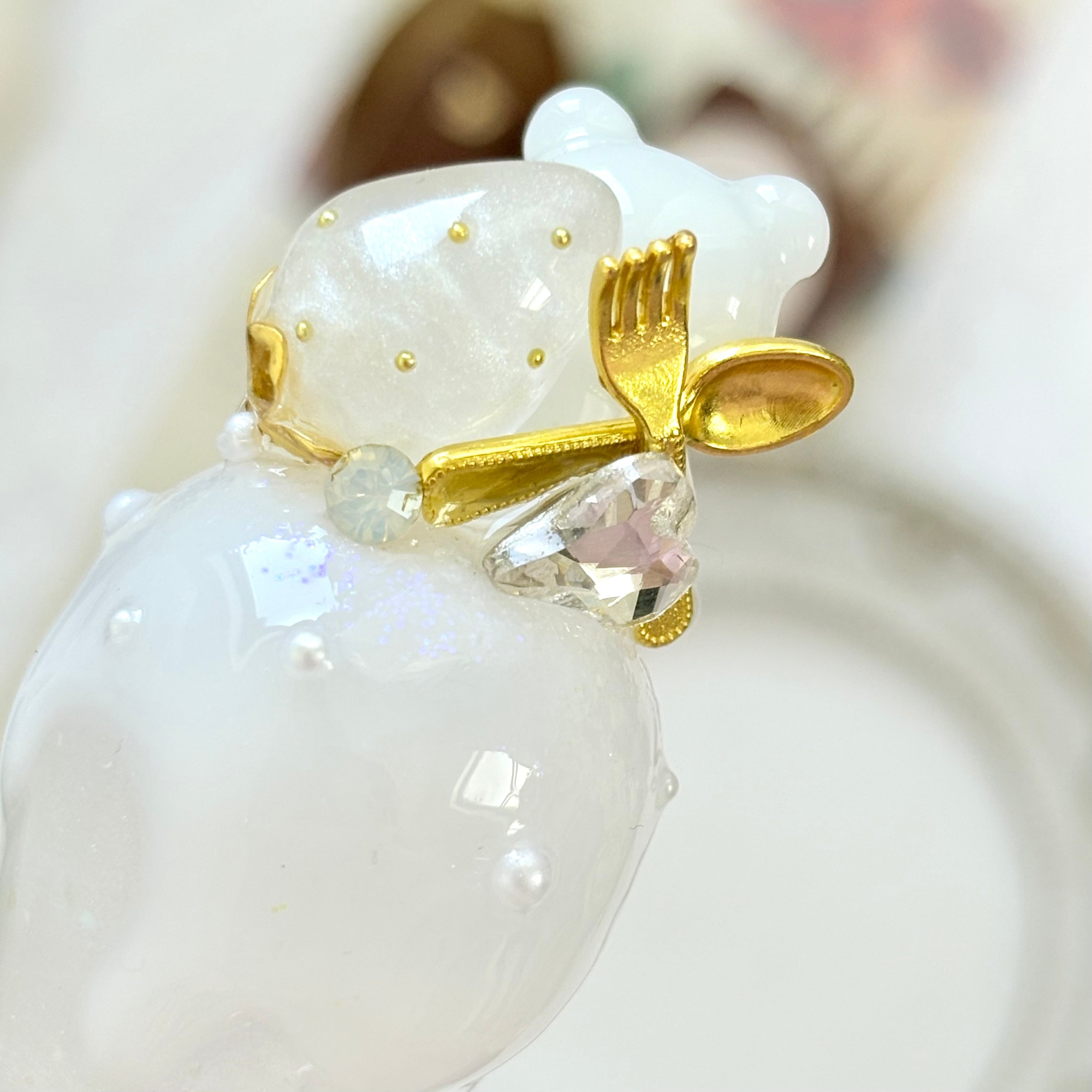 ・上部のデコレーション部分は接着剤で簡単に外れないように接着していますが、絶妙なバランスで乗せているため無理に力を入れるとストーンなどが外れてしまう場合があります。