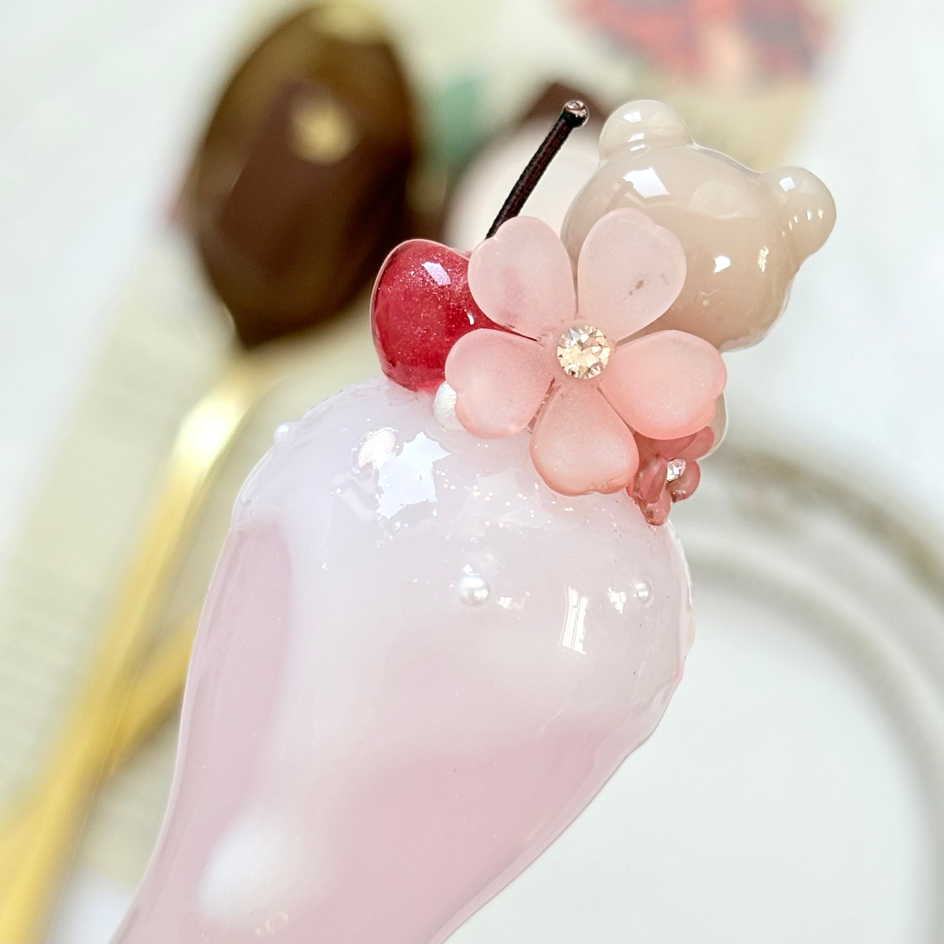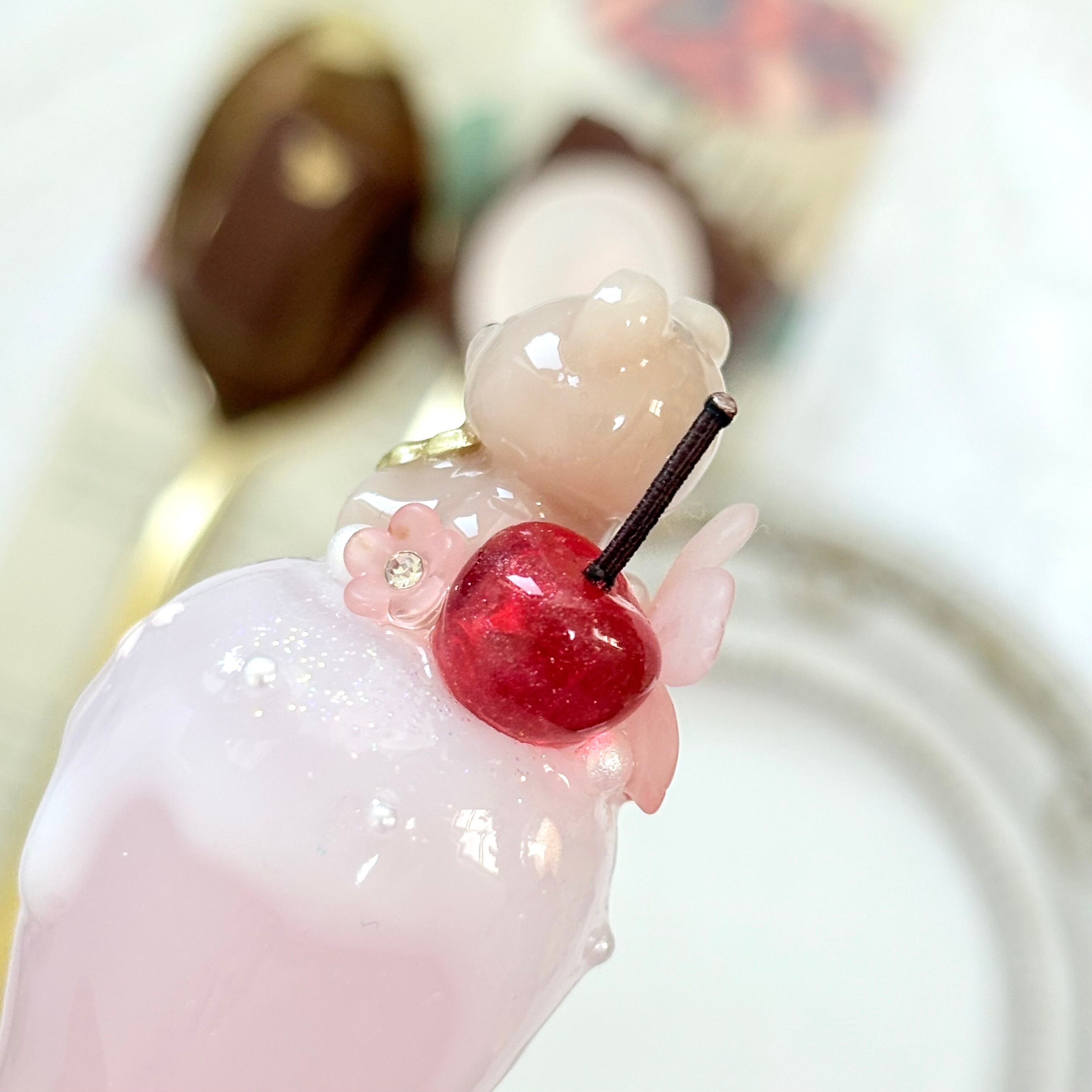 桜色のゼリーにクリームを掛けてシュガーラメにデコレーションをイメージして制作致しました。